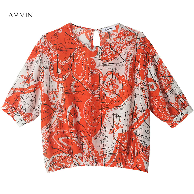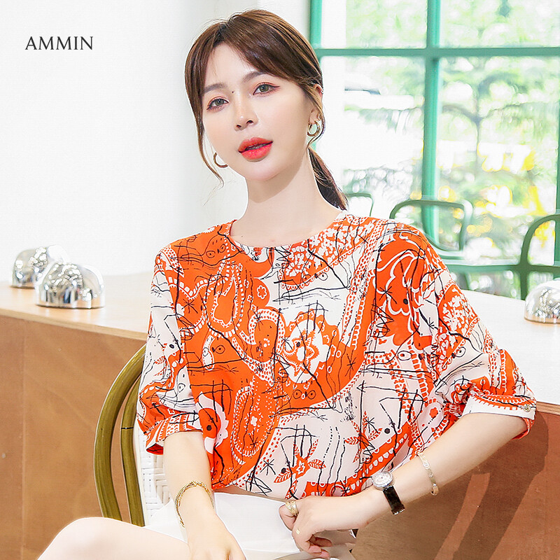 AMMIN Tops Short-sleeved round neck abstract printed chiffon shirt women's 2021 new style middle-sleeved loose-fitting casual western-style plus size blouse
