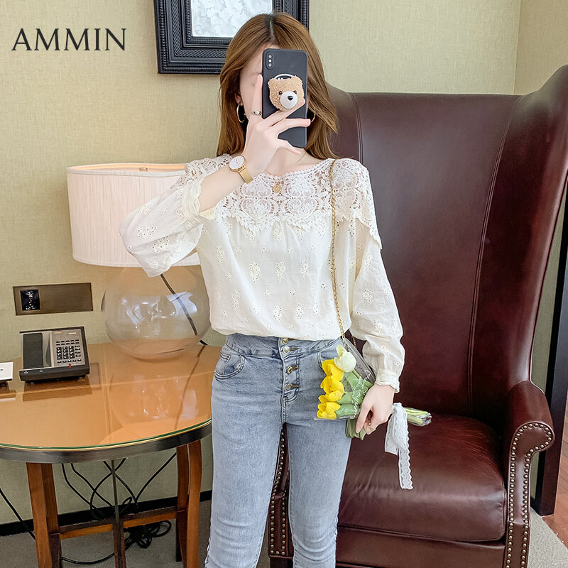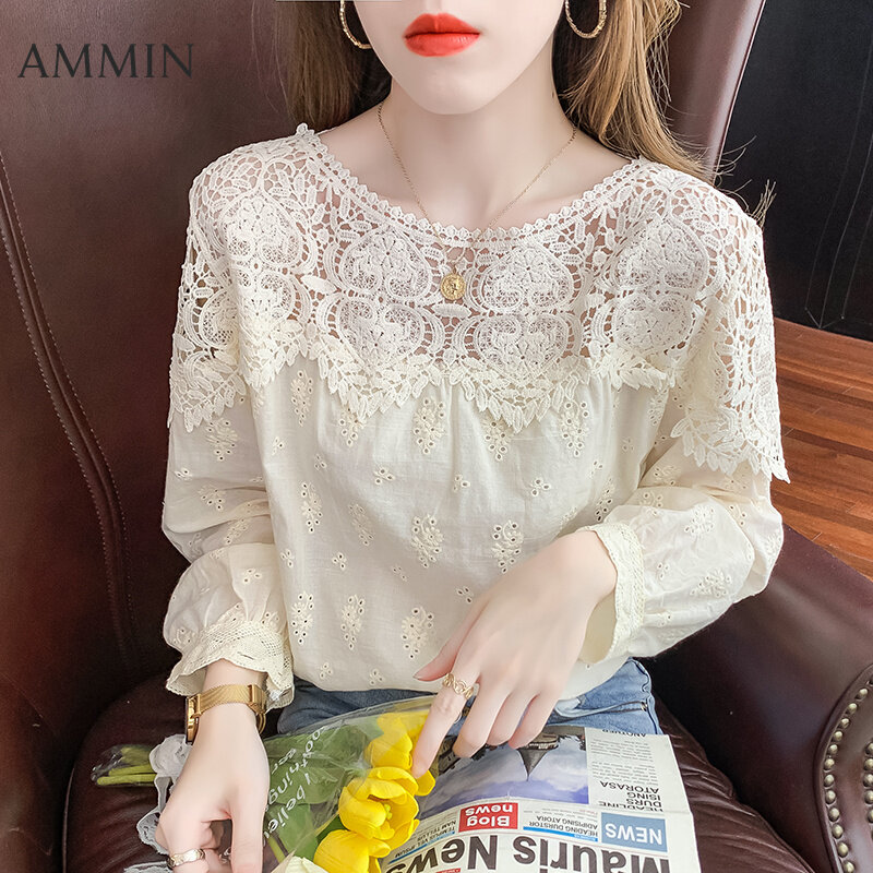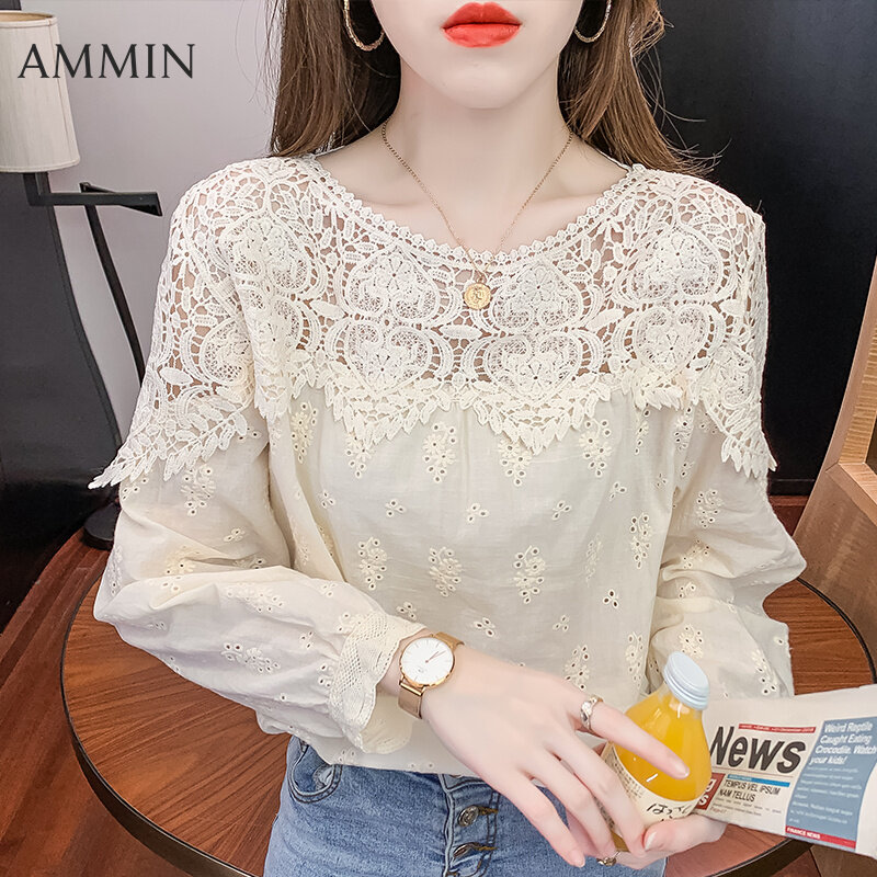 AMMIN Korean style women's long-sleeved hollow lace stitching embroidery lace shirt Fashion loose lace embroidery top Lady cotton linen embroidery Blouse