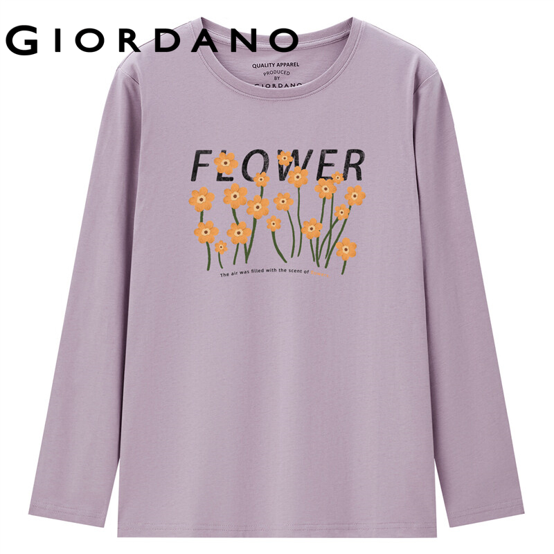 GIORDANO Women Huaxiansheng Series T-Shirts Crewneck 100% Cotton Casual T-Shirts Long Sleeve Crewneck Print Simple Tee 99392098