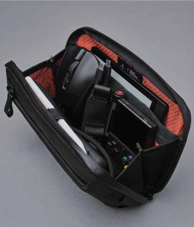 ?????????????? • Transforms into a sling bag (strap included) • Accordion-style opening • Weatherproof fabrics • X-Pac® VX42 Black • Fits a Kindle e-reader • 9 thoughtfully designed pockets across 2 compartments • Blood orange honeycomb 200D Ripstop Nylon • YKK waterproof zippers • Rear grab handle • Pen Slot ?????????? • 230mm (9”) x 135mm (5.3”) x 50mm (2”) • Weight: 200g