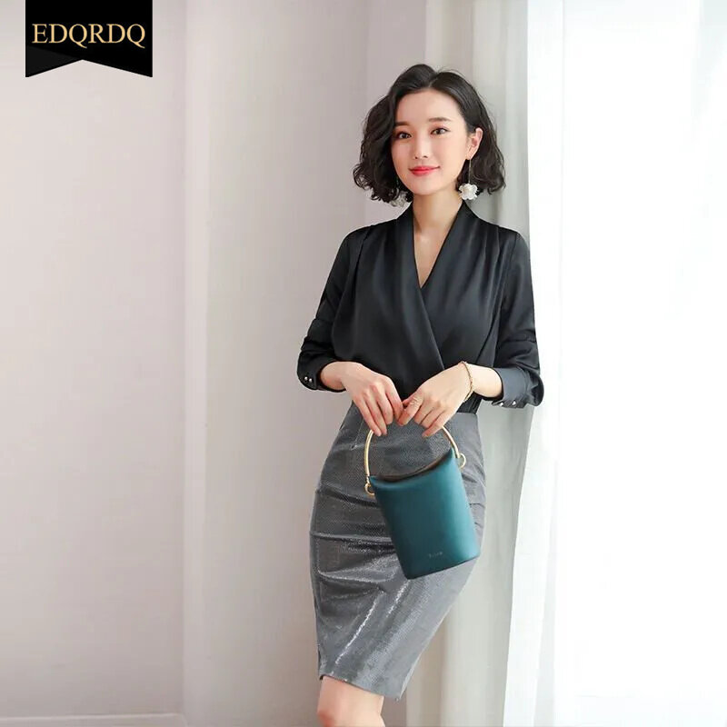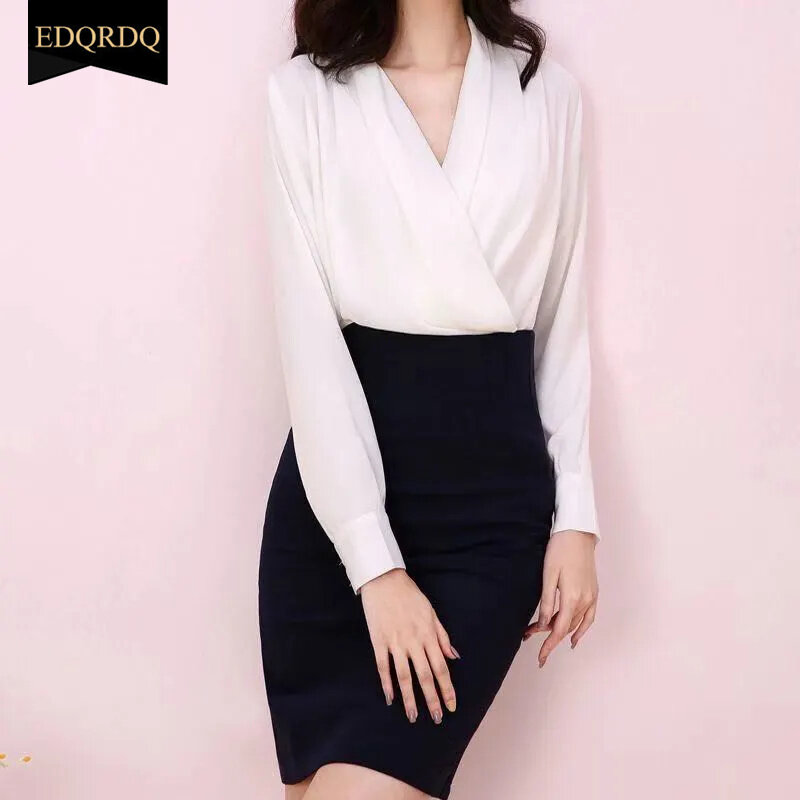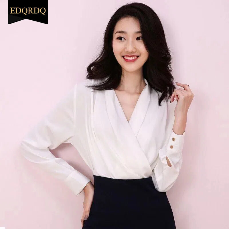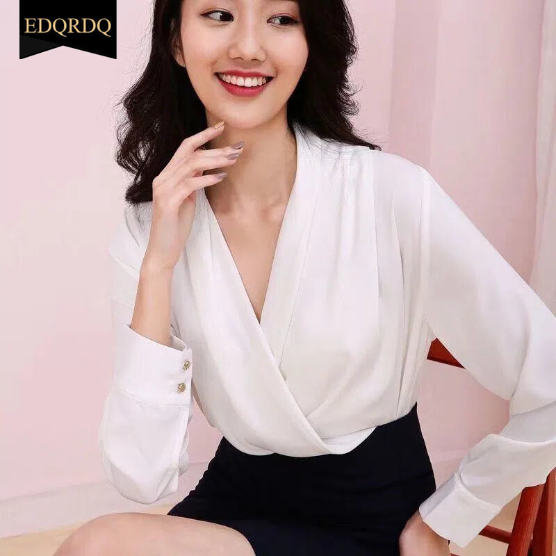 EDQRDQ Women's Casual Chiffon Tops V Neck Long Sleeve Elegant Shirts Wrap Blouses