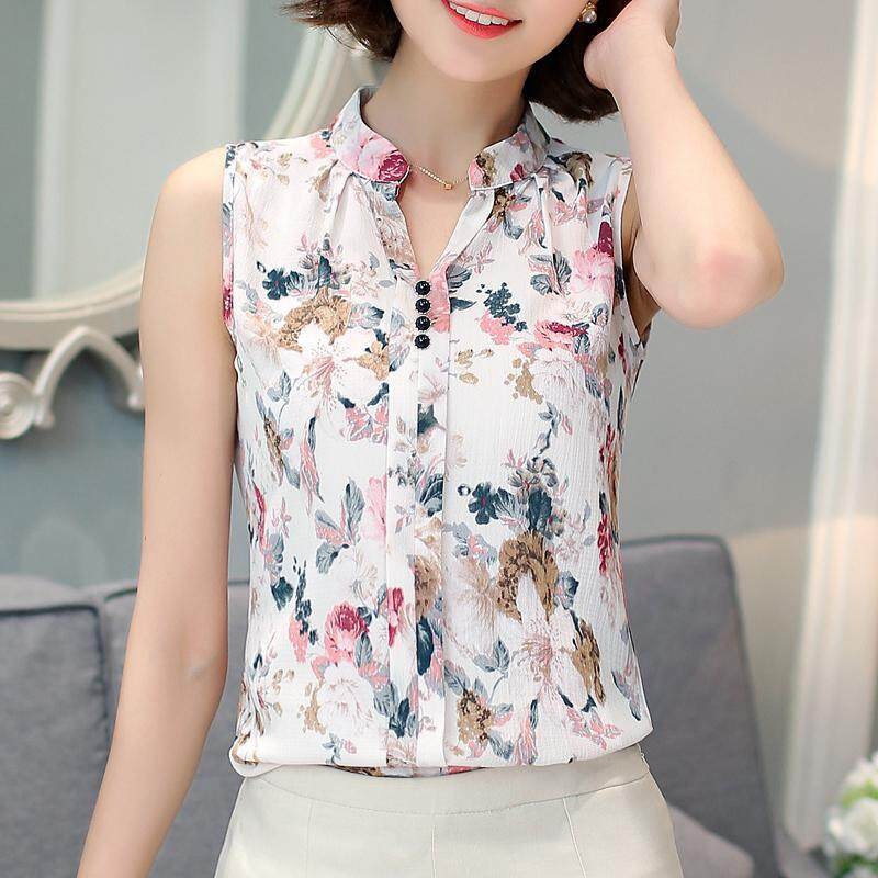 Female Fashion Sleeveless Floral Chiffon Shirts Women Summer Large Size Blouse Printed Tops