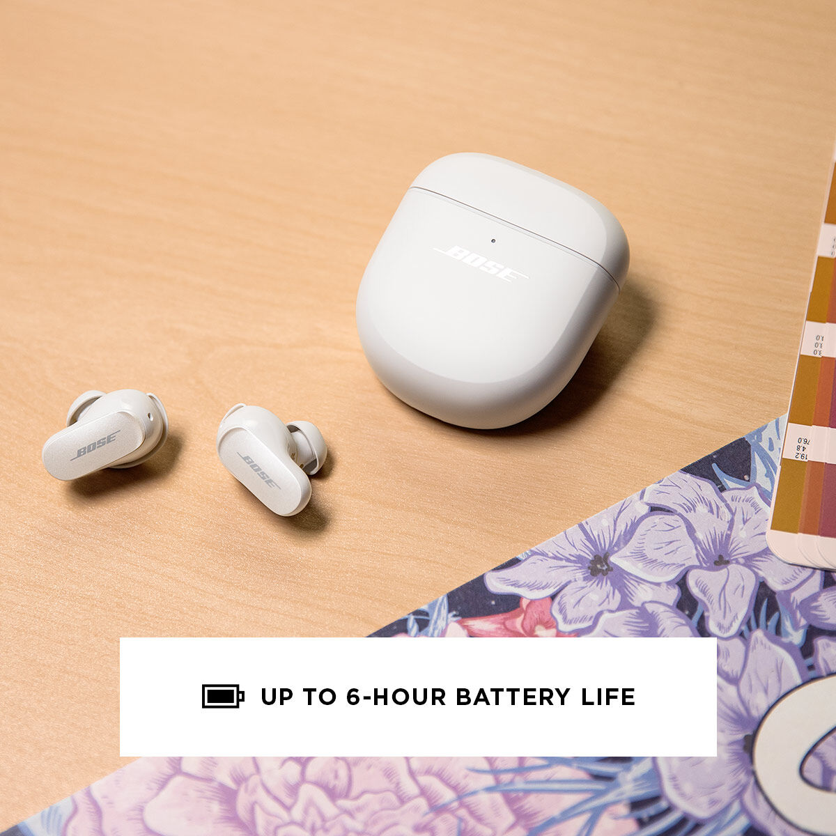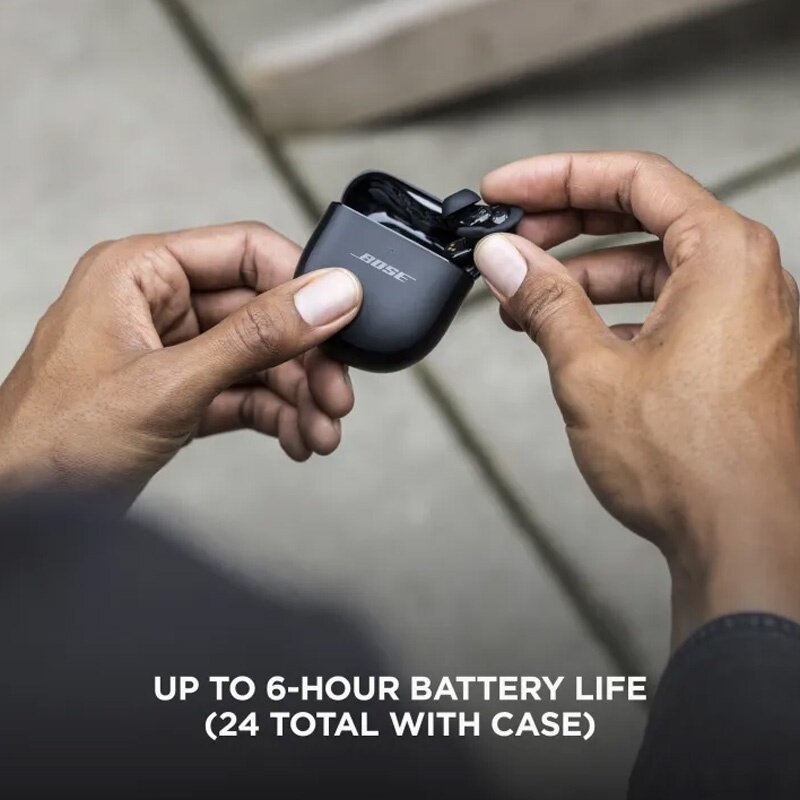 LONG LASTING BATTERY: Stay absorbed in the music you love for up to 6 hours. When not in use, store your Bose QuietComfort Earbuds II in the portable charging case -- it’s small enough to fit in your pocket. If the battery gets low, voice prompts let you know. Out of power and don’t have enough time to fully charge? The quick-charge option provides up to 2 hours of battery life from a 20-minute charge.